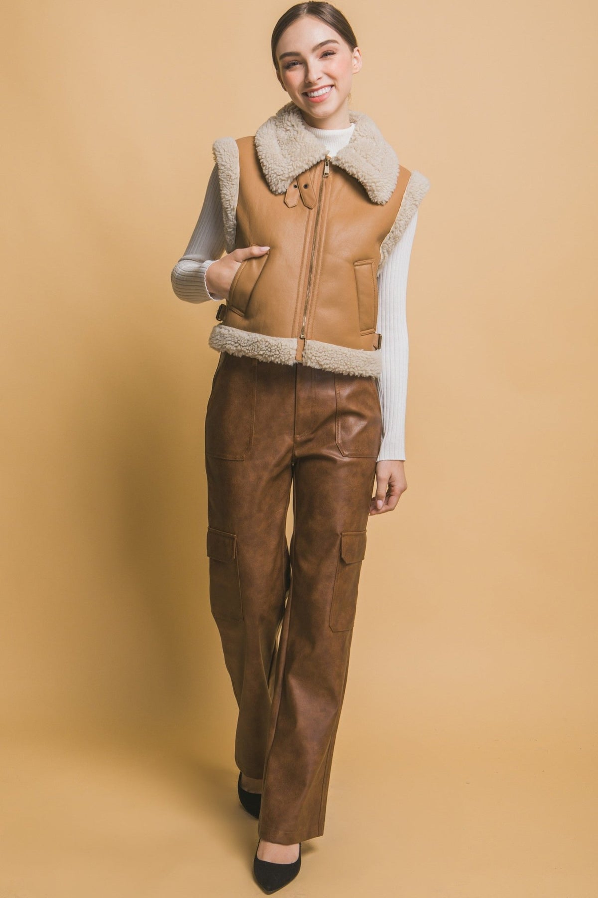 Edgy on the outside, cozy on the inside — the Faux Leather Shearling Vest is the piece that makes every fall and winter outfit feel more intentional. The sleek faux leather exterior and soft shearling lining create a texture contrast that’s genuinely stunning, while the asymmetric zipper and hand pockets add a cool, modern edge. Available in Camel and Black.